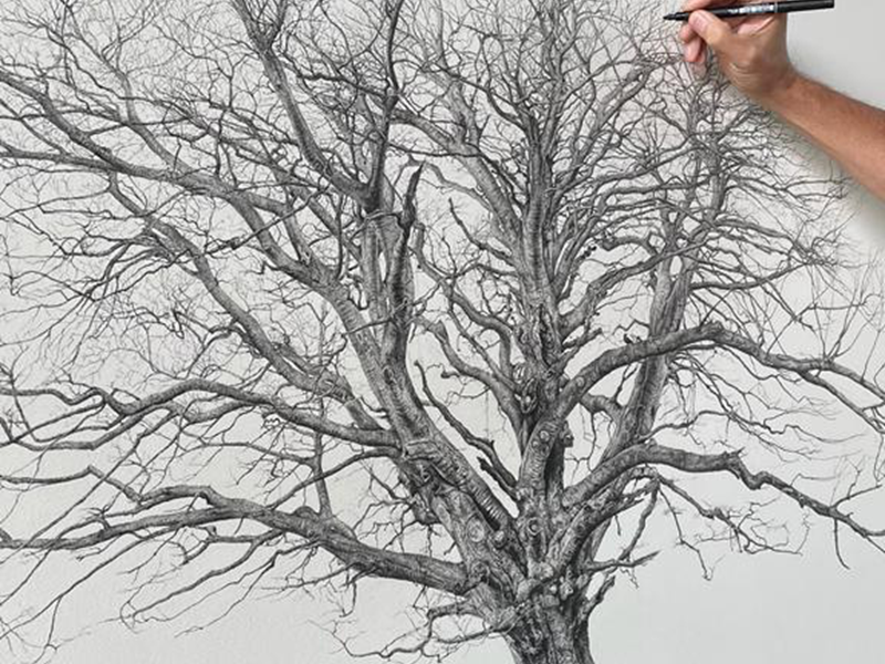 CJP, a former art director turned photographer and now fine artist, employs a 0.03mm Uninib pen to create his detailed pointillist drawings. His artistic journey reflects a deep bond between his disciplines, blending Imagination, illustration, and fine art to narrate the story of nature in a contemporary context. Of the new works CJP said “after seeing the Sycamore Gap tree felled I felt I needed to document the real experience of being in the presence of these magnificent organic shrines to nature and time. They are living documents of our country and world; places of note by their spiritual beauty, longevity and resilience”.